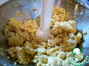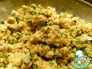 В готовый мятый нут положить заготовленную смесь, муку и хорошо перемешать.