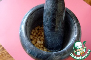 • С рулетиками закончили. Теперь приготовим соус. Орешки измельчить в ступке.