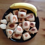Раскатайте тесто в пласт, нарежьте его на небольшие прямоугольники, на край которого положите по кружку банана. Соедините концы.