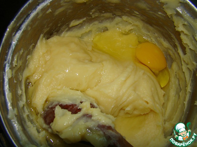 Далее, по 1-му вводим 4 яйца: вбиваем яйцо, интенсивно перемешиваем, пока оно полностью не вмешается в тесто. Можно сделать эту операцию в кухонном комбайне, так будет легче, но я не ищу легких путей и вмешивала яйца вручную деревянной ложкой. Тесто получается гладкое, однородное, влажное.