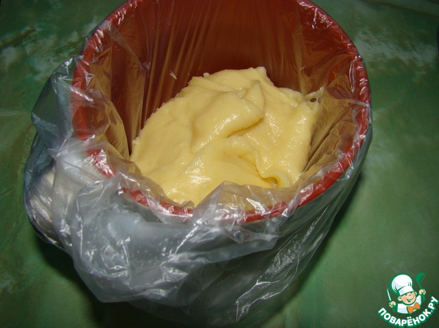 Перекладываем тесто в кондитерский мешок. Я использовала простой пакет, отрезав тонкий кончик и потом его просто выкинула.