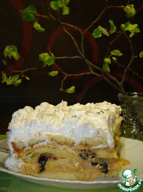 Нижний корж - бисквитный. Слой крема. Корж из заварного теста. Слой крема. Слой нарезанного соломкой чернослива (в оригинальном рецепте предлагался слой банана). Корж из заварного теста. Слой крема. Последний слой - бисквитный корж. Я делала торт накануне, чтобы он пропитался, а белковый крем делала на следующий день.