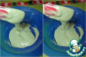 Скажу вам по секрету, я разделила на 2 части все ингредиенты, т. к. в очередной раз проводила испытания новой бумаги для выпечки и не совсем была уверена в дозировке красителя ( использовала сухой). Так что половина макарошек у меня получились интеллигентно-фисташ кового цвета, а другая половина... феерично - зелёного)