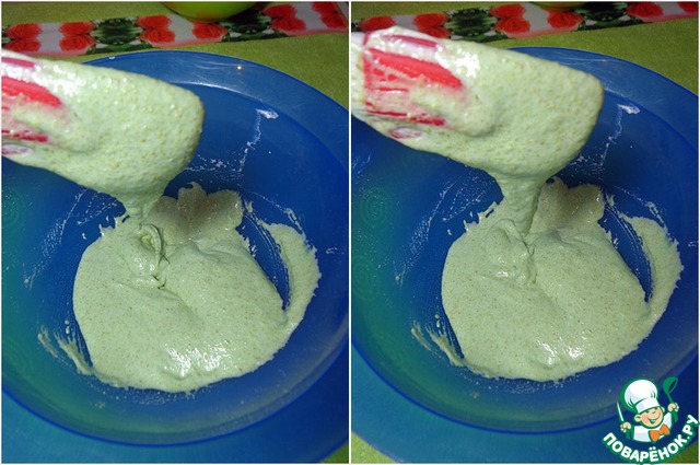 Можно ещё поступить следующим образом - когда тесто стало однородным, возьмите ложку теста и капните на блюдце. Оно должно разойтись, примерно как на фото. Но в то же время должно сохранять форму, а не растечься. Если хвостик на поверхности всё же остался, ещё немного перемешайте и снова повторите тест с блюдцем. -