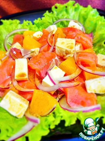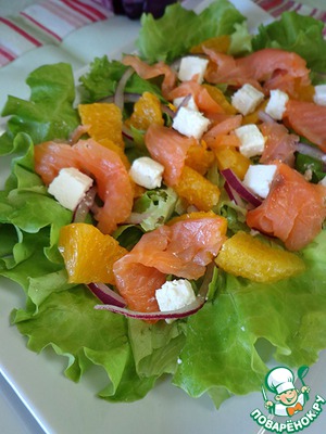 Собираем наш салат. На тарелку выложить листья салата, лук, фету, апельсины и тонко нарезанную рыбу. Полить заправкой.