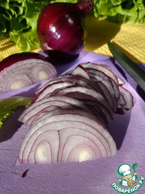 Лук нарезать полу-кольцами, залить холодной водой и оставить на 10 минут, чтобы ушла горечь. Я не отношу себя к поклонникам лука, так что после этой процедуры дополнительно замариновала его в апельсиновом соке.