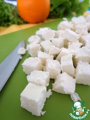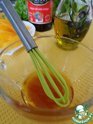 Для заправки смешать апельсиновый сок, оливковое масло, немного винного уксуса. Добавить соль, но это по желанию, так как сыр достаточно солёный, да и рыба тоже.