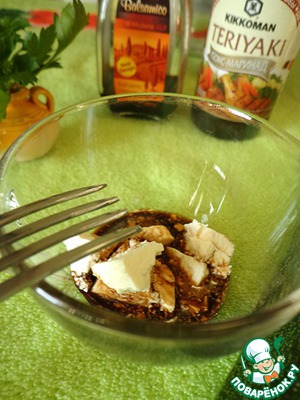 Для заправки смешиваем немного сыра (у меня фета), соевый соус, бальзамический уксус. Разминаем вилкой.