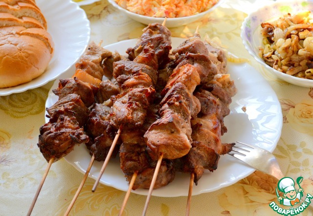 Мясо режем кусочками. Лук кольцами. Соль, приправу, перец. Все перемешать. Добавить сок лимона и минеральную воду. Оставить на час.