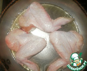Куриные крылышки солим, перчим. Если хотите, можно посыпать специями для курицы, но я этого не делала, так как соли и перца уже достаточно. Обжариваем крылышки на сильном огне, чтобы появилась корочка.