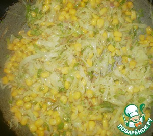К капусте чуть позже добавить банку консервированной кукурузы и зелень. Зелени брала довольно много, так как домашние любят.