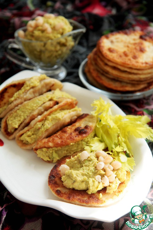 Авокадо был в наличии большой и спелый, при разрезании сразу обильно полила его лимонным соком. Фасоль была молодая и замороженная (она по вкусу деликатнее). От себя добавила цедру лайма, мне так показалось интересней. В тесто для лепешек добавила 1 ст.л. растительного масла и жарила на сухой сковороде. На лепешку клала "подушку" рукколы и сверху паштет. Мне было вкусно!