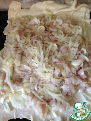 Раскатываем половину теста, выкладываем на противень смазанный немного маслом или на пергаментную бумагу. Сверху выкладываем начинку