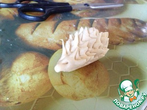 Выкладываем ежиков на "полянку" и смазываем все желтком, делаем несколько проколов, чтобы выходил пар. Убираем в духовку (предварительно разогретую до 200 градусов) на 35 минут (примерно).