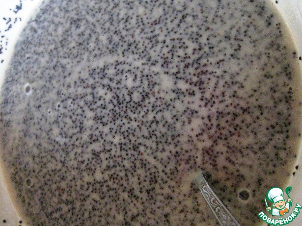 Смешать сахар, воду, мед и масло. Оставим немного воды для глазури (3 ст. л.). Также замочим мак на 30 минут в кипятке, после этого времени его хорошо отжать.
