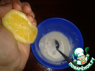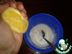 В отдельную мисочку или чашку высыпать разрыхлитель и погасить его лимонным соком.