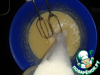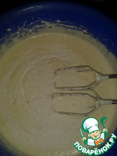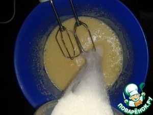 Во всю эту массу всыпать погашенный разрыхлитель, и сразу за ним легонько, понемножку всыпать муку. Вымешать миксером на минимальной скорости, но не сбивать, тоесть делать быстро, чтоб просто масса стала однородной.