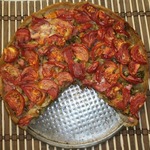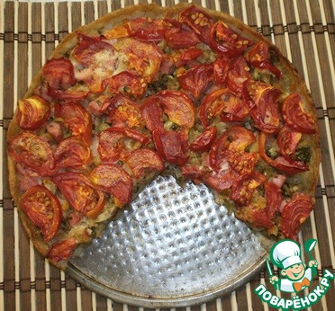 Тесто раскатываем и аккуратно переносим в форму, чтобы были бортики, сверху выкладываем начинку, затем нарезанные кружками помидоры.