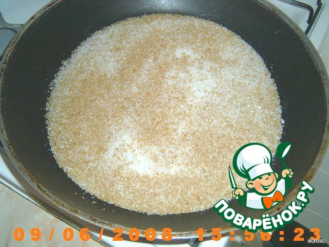 Сахарный песок высыпать в сковородку, на умеренном огне нагреть сахар до золотисто-коричневого цвета. Перемешивать деревянной лопаточкой.