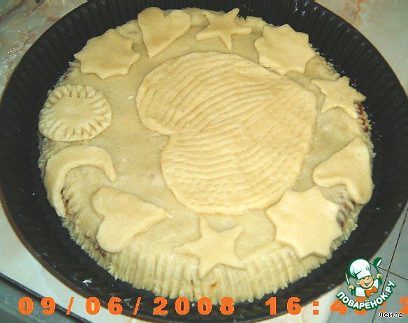 На слегка присыпанной поверхности раскатать тесто толщиной 4 мм. Вырезать по форме круг. Положить начинку. Аккуратно вырезать тесто для верхнего коржа. Накрыть начинку. Края слегка прижать. Из оставшегося теста сделать фигурки. Хорошенько взболтать желток с молоком, обмазать верх торта. Выпекать в середине духовки приблизительно 40 минут. -