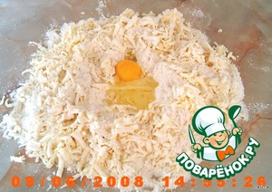 Муку выложить холмиком, масло натереть на крупной терке, сверху посыпать солью, вбить яйцо. Порубить в мелкую крошку.