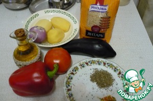 Баклажан почистили от шкурки, нарезали средней соломкой и замочили в холодной очень соленой воде, чтобы ушла горечь. Рис промыли и поставили вариться согласно инструкции. Картофель нарезали средней соломкой, перец средними и помидор крупными кубиками. Лук нарезать.
