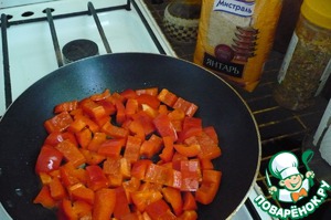 Обжарить по отдельности на масле перец и промытый баклажан до готовности и положить к картофелю.