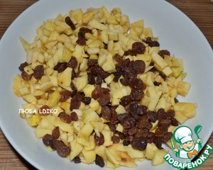 Первый вариант у меня - с яблоками и изюмом. Изюм заранее замочить в роме и обсушить. Яблоки очистить, порезать маленькими кубиками, можно сбрызнуть лимонным соком. Всё перемешать. -