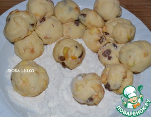 Вмешать в тесто и сформировать небольшие шарики. Можно и не смешивать, а положить внутрь. Тогда шарики нужно делать обязательно маленькими.