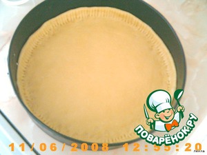 Тесто разделить на 2 части. Куском побольше выстелить форму, сделать бортики.