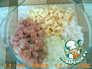 Сделать начинку. Филе курицы, картошку (я положила полстакана вареного риса), лук нарезать одинаковыми кубиками, масло. Посолить, поперчить.