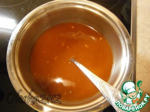 Готовим соус. Для этого наливаем томатный сок в сотейник. (Если используете томаты консервированные в соб. соку, то томаты размять и вместе с соком влить в сотейник). Добавляем измельченный чеснок, соль, уксус, сахар, перец чёрный молотый, перец красный молотый (или стручок свежего, разрезанный пополам и очищенный от семян). Ставим на плиту и нагреваем.