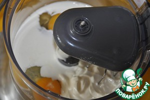 В блендере взбиваем яйца и сметану.