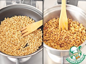 Обсушенную крупу обжарить на сухой тефлоновой сковороде. Обжариваем до светло-коричневого цвета, таким образом, крупа приобретает ореховый привкус. Она уже, практически, наполовину готова и такая вкусная получается. Я её постоянно таскала со сковороды по одной штучке. Такая же "зараза", как и семечки, рука так и тянется за ними...)) Хоть и не по теме, но напишу, что такую обжаренную перловку, думаю, здорово добавлять к мюсли и заливать йогуртом, на завтрак то, что нужно.