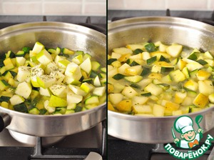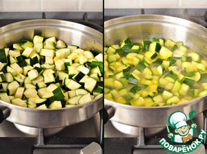 В сотейник налить 3 ст. л. оливкового масла, обжарить цуккини, залить кипящей водой - 750 мл, посолить, дать закипеть и потушить немного, минут пять.