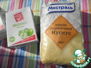 Берем яблочный сок и кус-кус. И приступаем к приготовлению салата. Начнем с того, что яблочный сок нальем в кастрюлю и доведем его до кипения. Медленно всыплем, помешивая, кус-кус. Снимем кастрюлю с огня, закроем кастрюлю крышкой и оставим на 10 мин.