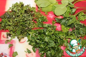 Зелень петрушки и мяты промыть холодной водой, просушить и измельчить.