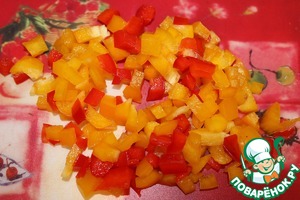 Перец я взяла разноцветный. Для салата нам понадобится 1/2 перца, который мелко нарезать на кубики. Оставшийся перец пойдет на оформление, точнее, на подачу.
