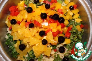 Теперь добавить в кус-кус перец, зелень, смородину и половину нарезанного апельсина.