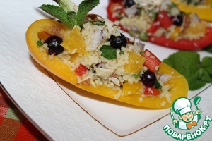 Можно салат подать порционно. Перец разрезать на половинки и наполнить их салатом.
