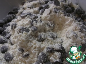Муку, крахмал, миндаль, разрыхлитель соединить и добавить к ним шоколадные капли. Перемешать.