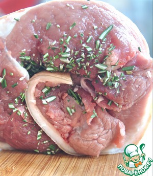 Аккуратно свернуть мясо в рулет. Связать кулинарным шпагатом или толстой ниткой.
