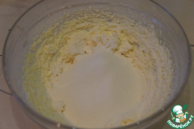 Сверху просеять муку с разрыхлителем. Перемешать и замесить тесто. Оно получается очень мягкое. Скатать тесто в шар, завернуть в пленку и убрать в морозилку.