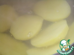 Картофель очистить и отварить с лавровыми листами. За 10 минут до окончания варки добавить соль.