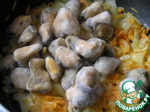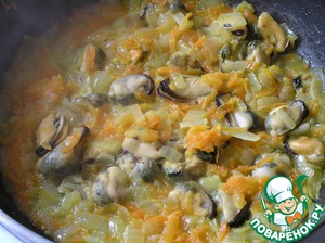 Добавить мидии (не размораживая), готовить под крышкой до размораживания, затем крышку снять.