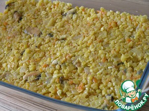 Форму для запекания смазать маслом, выдожить мидии с чечевицей, разровнять.