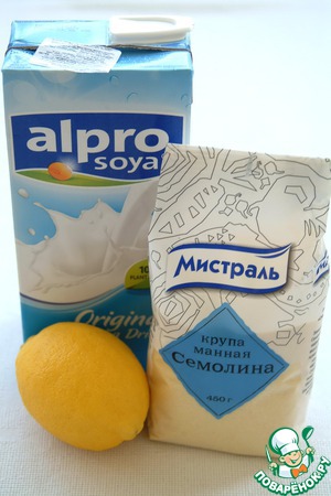 3 стакана соевого молока вскипятить, добавить 3 ст. л. семолины, сахар, ванильный сахар и варить минут 15 до готовности семолины. Добавить лимонный сок. Чуть остудить и взбивать миксером, пока масса не увеличится вдвое.