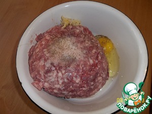 В фарш добавляем соль, перец, измельченный чеснок и яйцо. Все хорошо перемешать.
