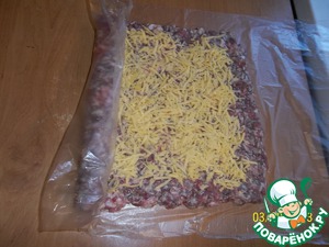Фарш посыпаем натертым сыром, отступая немного от края (что бы мясо прилипло когда будем сворачивать рулет)