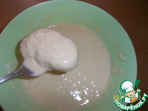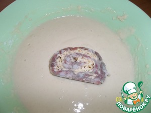Пока рулет отдыхает, делаем кляр. Соединяем яйцо, молоко и муку, по желанию можно посолить. Должно получится по консистенции густой сметаны.